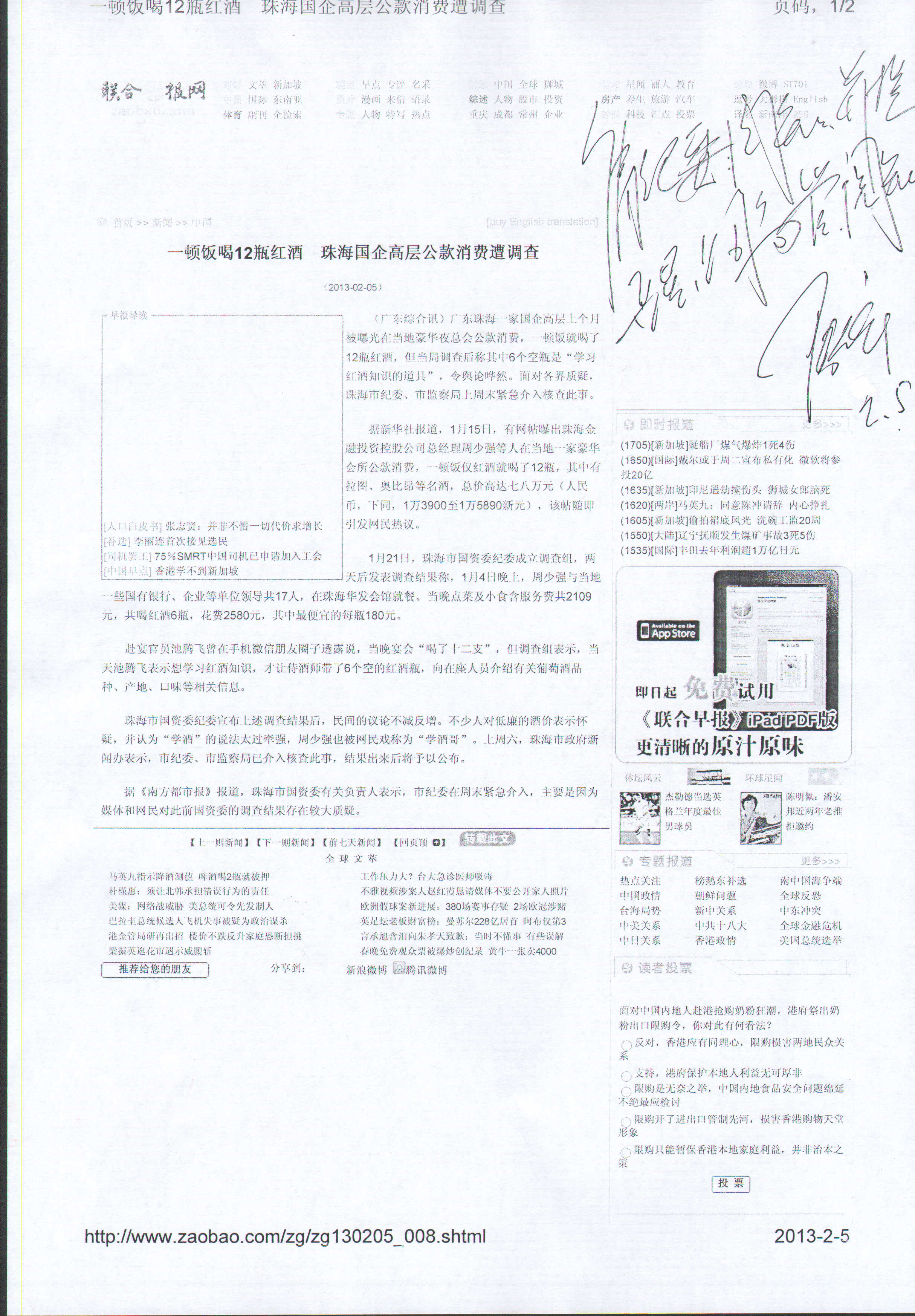 陸金龍董事長對網載“珠海國企高層公款消費”作出批示,提醒公司高管引以為戒 時間:2013-02-065479 陸金龍董事長對網載“珠海國企高層公款消費” 作出批示,提醒公司高管引以為戒 2月5日聯合早報網登刊信息“一頓飯喝12瓶紅酒 珠海國企高層公款消費遭調查”,陸金龍董事長即日批示:“請紀委閱知,并提醒公司高管閱知”。公司紀委、紀監室也當即將此精神向公司上下作了傳達,要求嚴格按公司廉政細則十二條辦事,如有違犯將層層追究責任。